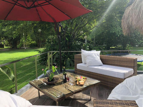 The rate includes a welcome drink, light snacks and use of the pool, trampoline, bikes and playground.